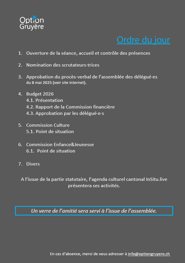 Option Gruyère informe que sa prochaine Assemblée des délégué.e.s aura lieu le mercredi 12 novembre 2025, dans la commune de Bulle (ordre du jour ci-dessus).